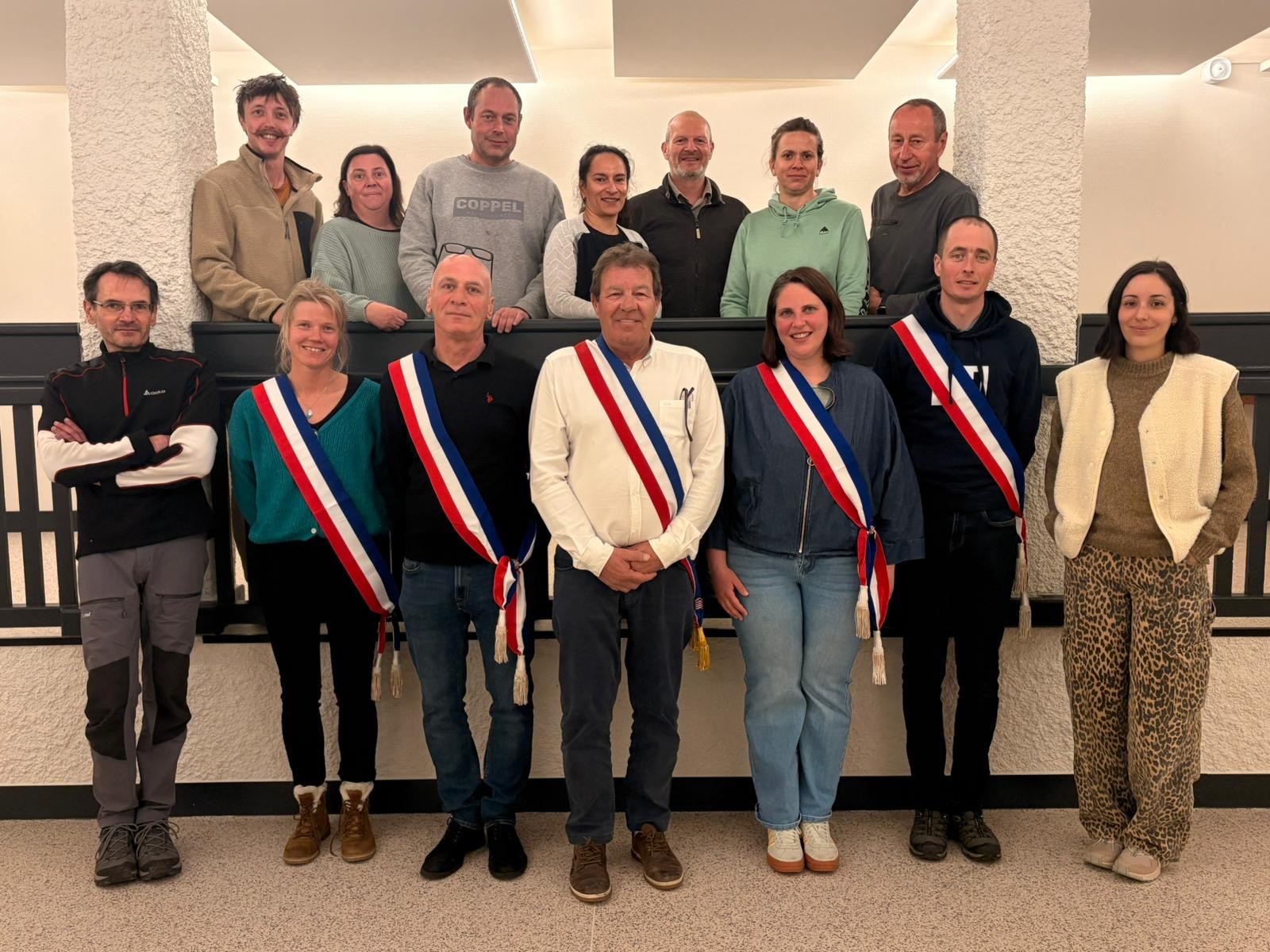Sur la photo de gauche à droite _ 1er rang : Cyrille MOIRANT, Jeanne DE NAVACELLE (3e Adjointe) , Jérôme PERRET (2e Adjoint) , Eric MISSILLIER (Maire) , Pauline BOISIER (1e Ajointe) , Olivier NICODEX (4e Adjoint) , Maéva NAVAS _ 2e rang : Jérémy PLANCHE, Stéphanie ARDUINI, Fréderic DESGRANGES, Natacha DURAND FAVRAT, Emmanuel JOSSERAND JOFFRE, Cécile NEVEU PASTEL, Denis ROSSIGNOL _ Absente de la photo : Marlène DEPERY